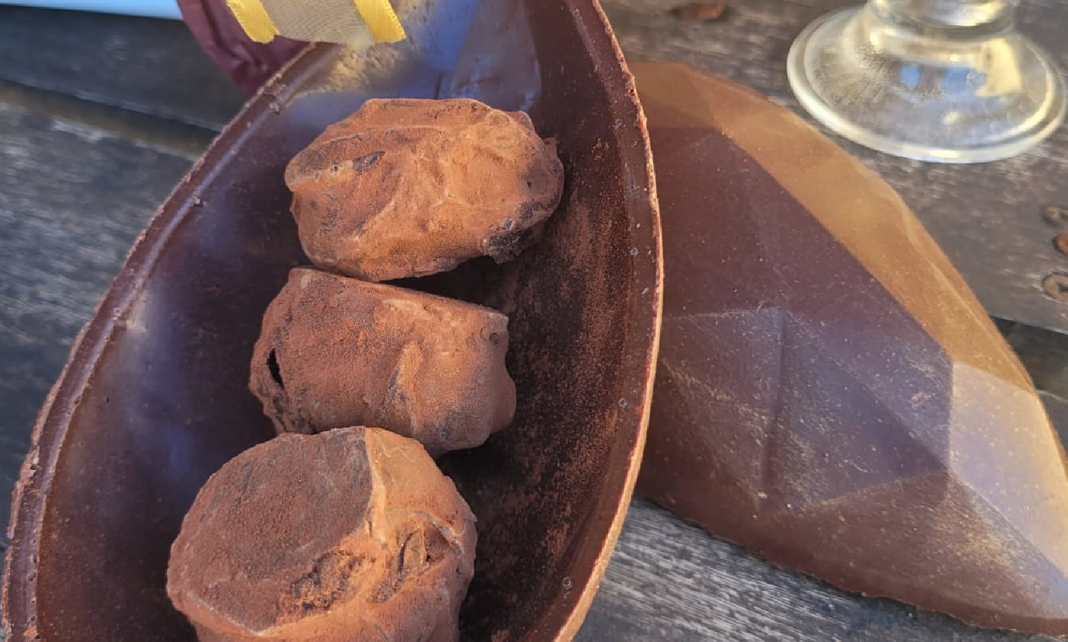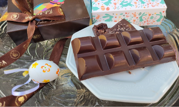 Massa Amendoa e Açúcar Mascavo, mousse de chocolate amargo, mousse de chocolate branco, mousse de chocolate “ao leite” e Decoração de Pascoa.