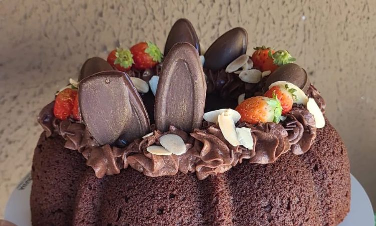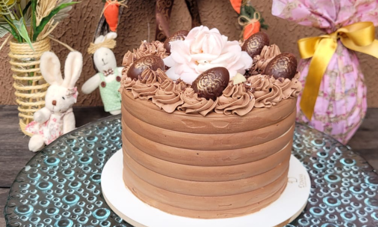 Massa de Cacau com cobertura de chocolate, finalizado com mini ovinhos de chocolate e mini orelhas.