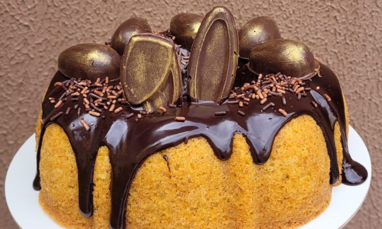 Massa de Cenoura com cobertura de chocolate, finalizado com mini ovos e mini orelhas.